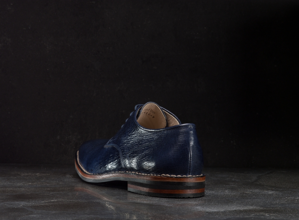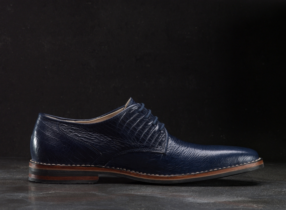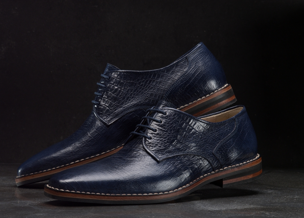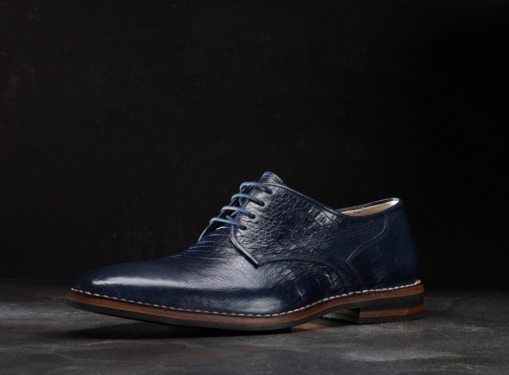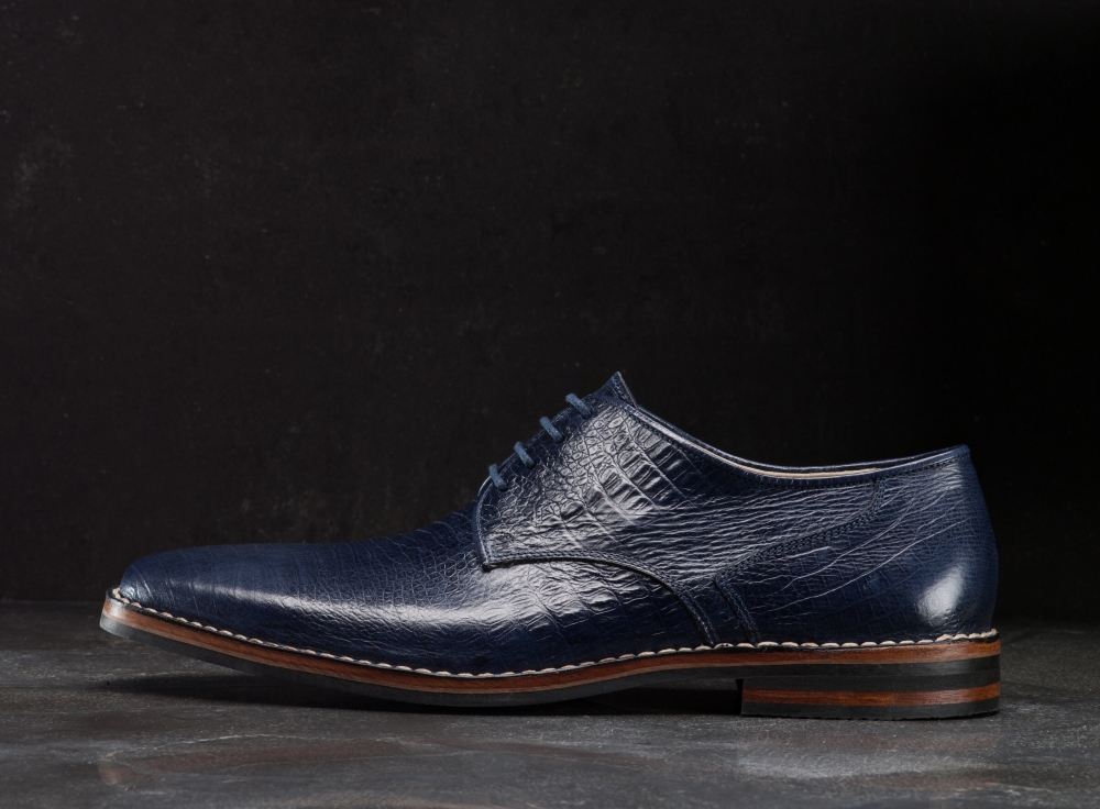 De schoen is afgewerkt met blauw fantasie krokodil print leer en wordt voorzien van een comfortabel voetbed.