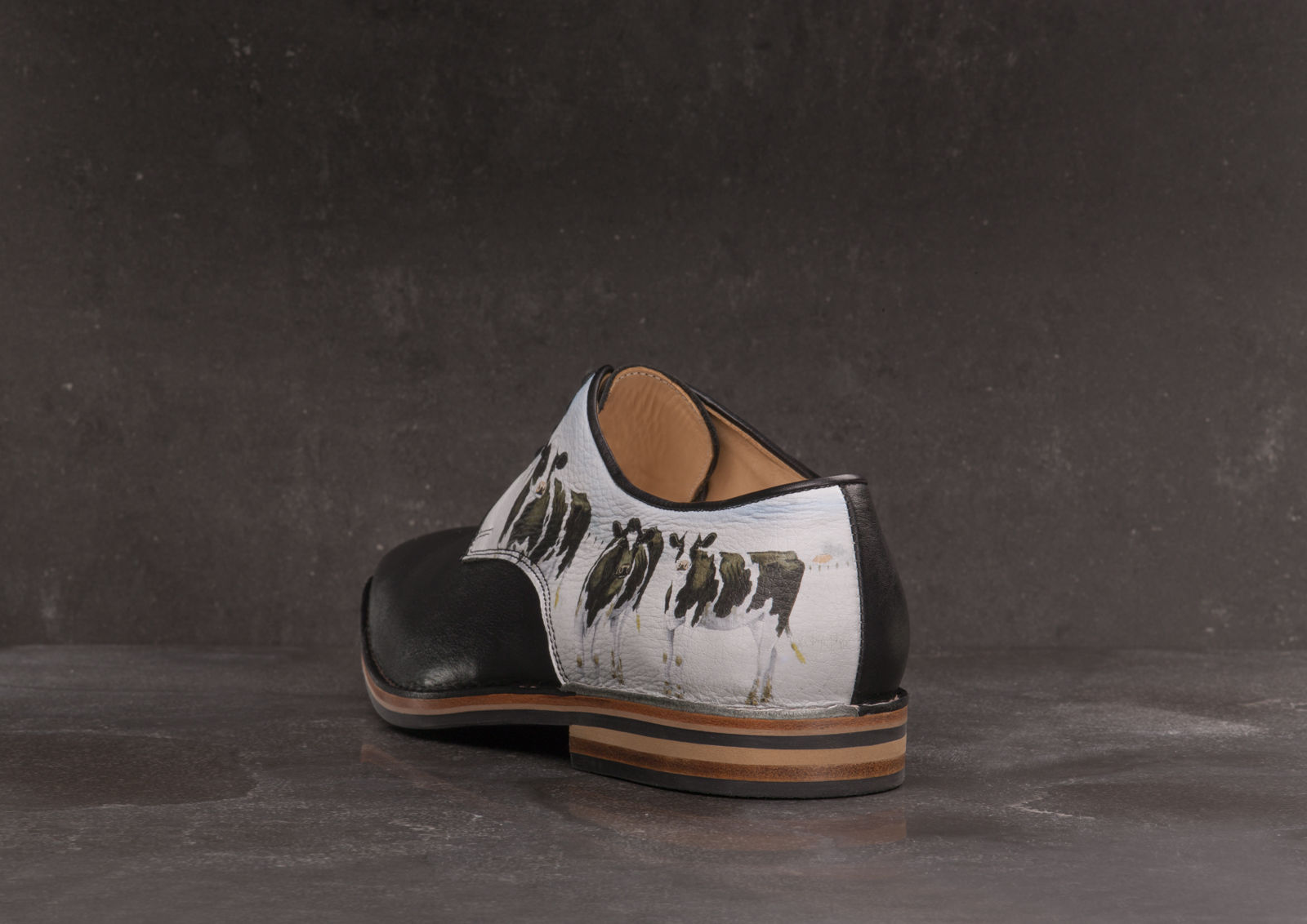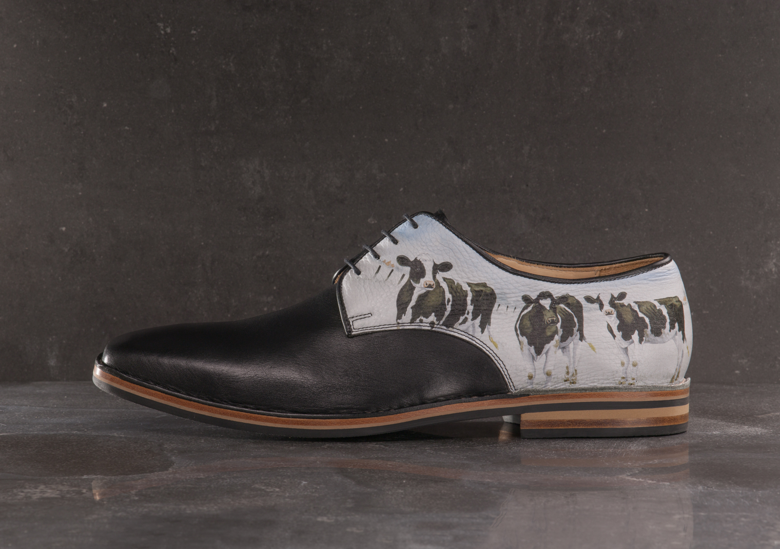 Wiebe van der Zee werkte met alle liefde mee aan de Custom Comfort collectie. De Friese kunstschilder is vooral bekend van zijn aquarellen van koeien en andere boerderijdieren, maar zag in het uitwerken van twee kunstwerken op een schoenpatroon een nieuwe uitdaging. In vele huiskamers hangt een ‘Wiebe’, maar jij kunt er één dragen aan je voeten.